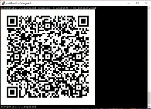 Ezután elkészítjük a QR kódot az alábbi paranccsal:root@unifi:~/wireguard# qrencode -t ansiutf8 < wg_iphone8.conf