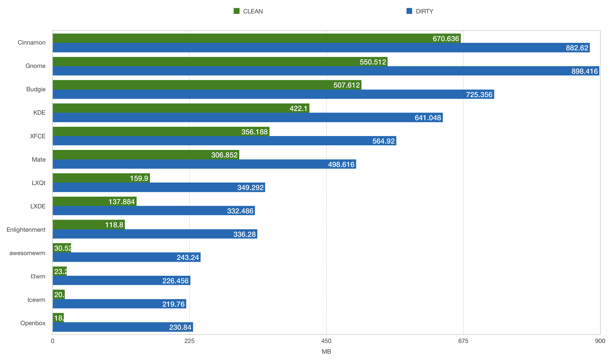 Szeretnék egy kicsit aktuális képet mutatni a jelenlegi (2018-04-01) helyzetről azzal kapcsolatban hogy Linux alatt a népszerű asztali környezetek között milyen különbségek vannak alap memória fogyasztásban.