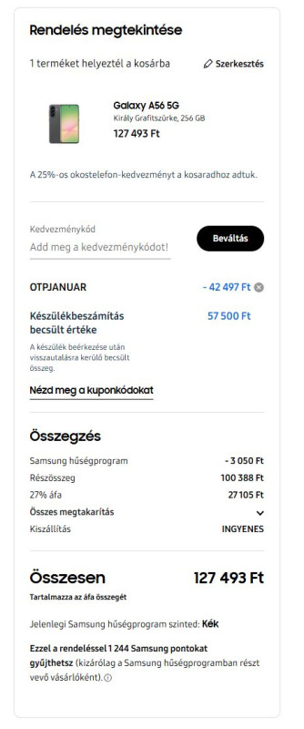 Ami az árakat illeti. A fentebbi képen látható, hogy nekem nagyjából 67 E Ft-ra jön ki a történet. Az A54-est már elküldtem, úton van Észtországba. Ez már kuponnal együtt kedvezményesebb ár, mint amikor az első Samsungomat vásároltam a Galaxy A50-et, Telenor előfizetéssel, mert az akkor 90 E Ft-ba került nekem 2019-ben. Persze most adtam érte egy 2 éves telefont, de az meg nem 90 E Ft volt, mert akkor az előfizetés csak amiatt kellett...