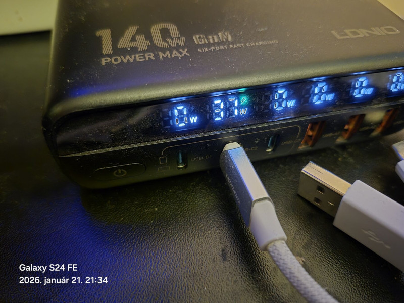 Korábban, a régebbi A54-et a gyári 25W-os Samsung töltővel pumpáltam a legtöbbször, de mivel azzal nem lehetséges 45W-tal tölteni, így az LDNIO A6140C-hez fordultam. 2M-es Toockie kábelt használok hozzá, de mivel 40%- alatt még nem volt a telefon, ezért 29W-os teljesítményfelvétel maximumot sikerült "csak" megörökíteni.