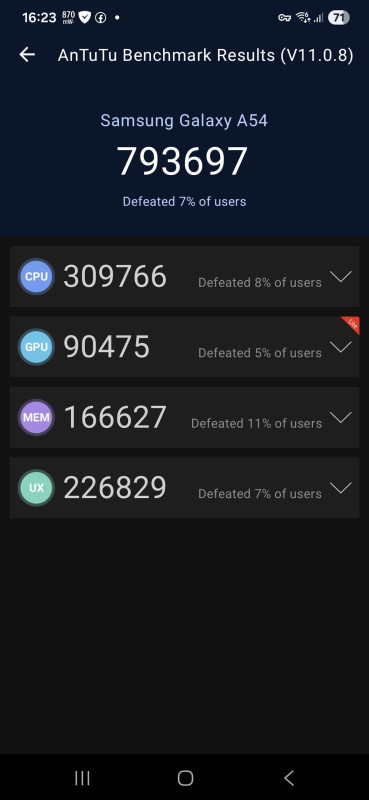 A legújabb AnTuTu verzióban megváltozott a pontozás. A korábbi verziókban 560K körül kapott az A54, itt viszont 793 E -t, de azt is tudni kell, hogy az A54-en az AnTuTu-ból is olyan verzió fut le csak, amiben nincs benne minden modul, vélhetőleg nem bírja a cucc... vagy inkompatibilis vele. Ezért csak egy Lite verzió megy ... Viszont látható, hogy az A56 fölénye itt is elsöprő. Vannak még GeekBench 4/5/6 eredmények is, de azokat majd 3DMarkkal egy külön blogposztba teszem be esetleg. Akit komolyan érdekel a téma, az itt is láthatja, hogy volt jelentős fejlődés minden téren az A56 javára és alapvetően egy méltó utódot kapott az A sorozat legerősebb tagjaként.