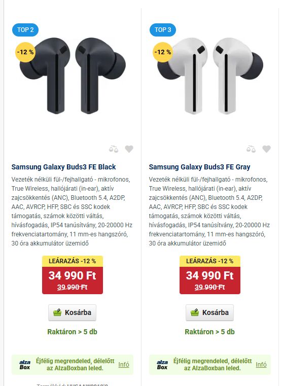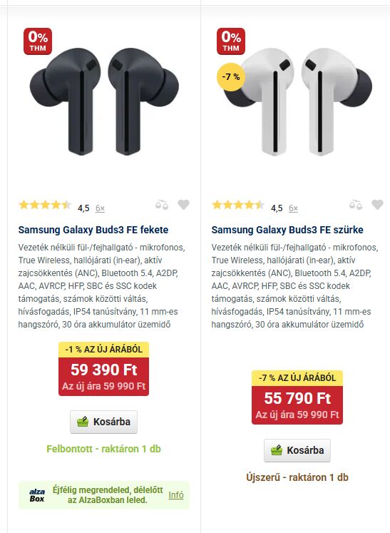 és aztán megpillantottam a korrekt árazású, 40K-ból is 12%-kal olcsóbb Samsung Galaxy Buds3 FE Black 34 990 Ft-ért - Vezeték nélküli fül-/fejhallgató | Alza.hu Buds 3 FE-t. Volt még 1500 Ft-os kuponom, van Alza+ előfizetésem, tehát még a szállítás árát is megspóroltam.