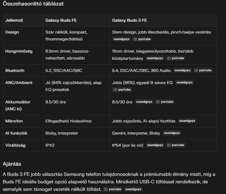Üzemidő szempontjából is előrelépés elvileg. Gyakorlatban még nem tudom, mert elmentem vele Ebesre, kimentem a parkba utána az ebesi házban nem volt rajtam. Fejlődött IP védelem alapján (IP54), jobb a mikrofon minősége, beveti az AI-t, amit használ a Gemini-hoz, és a hangzás tisztításához is. A hangszórók mérete majdnem duplájára nőtt, már Bluetooth 5.4-gyel van szerelve, szóval minden szempontból egy újabb konstrukció mint a Buds FE volt.