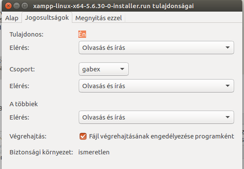 A letöltött .run kiterjesztésű fájlt tegyük futatthatóvá. Jobb klikk a fájlon Tulajdonságok -> Jogosultságok -> Végrehajtás: résznél "A fájl végrehajtásának engedélyezése programként" pipáljuk ki, mint ahogyan az az alábbi képen látható.
