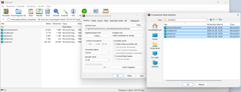 Elsőnek csináljunk egy mentést, ehhez készítsünk itt egy temp könyvtárat amibe ideiglenesen berakjuk a fájlokat, majd használat után törölhetjük őket. Totalcommander-ben F7 gomb, vagy jobb klikk a legfelső állomány felett „Új” majd „Új mappa”, legyen mondjuk „xyz” a neve. Az initial.pak állományon jobb klikk, „Másolás”, ugrás bele az XYZ-be és jobb klikk „beillesztés”, át is nevezhetjük mondjuk initial_eredeti.pak névre (jobb klikk, átnevezés), de maradhat is. Ha elrontanánk akkor ezt vissza tudjuk majd másolni. Másoljuk ide az XYZ-be a leszedett trees_dawn_update.zip-et, és csomagoljuk ki, jobb klikk, összes kibontása. Létrejön a „trees_dawn_update” könyvtár, lépjünk bele, ott a „_templates” könyvtár, azon belül meg 4 állomány, ami már át van állítva, nekünk csak telepíteni kell. Indítsuk el a winrar-t, jussunk el a client könyvtárba és lépjünk bele az „initial.pak” állományba, majd „media\_templates\” könyvtárba. Kattintás a hozzáadás gombra, majd jussunk el a xyz könyvtárba, ott a „trees_dawn_update\_templates” lévő 4 állományhoz. Jelöljük ki mind a négyet egérrel, OK, majd ha a következő OK-ra is rákattintunk akkor kicseréli a 4 állományt és újra csomagolja. Lehet használni a játékot, bon a petite. És gyakorlatilag mindent így fogunk majd telepíteni.