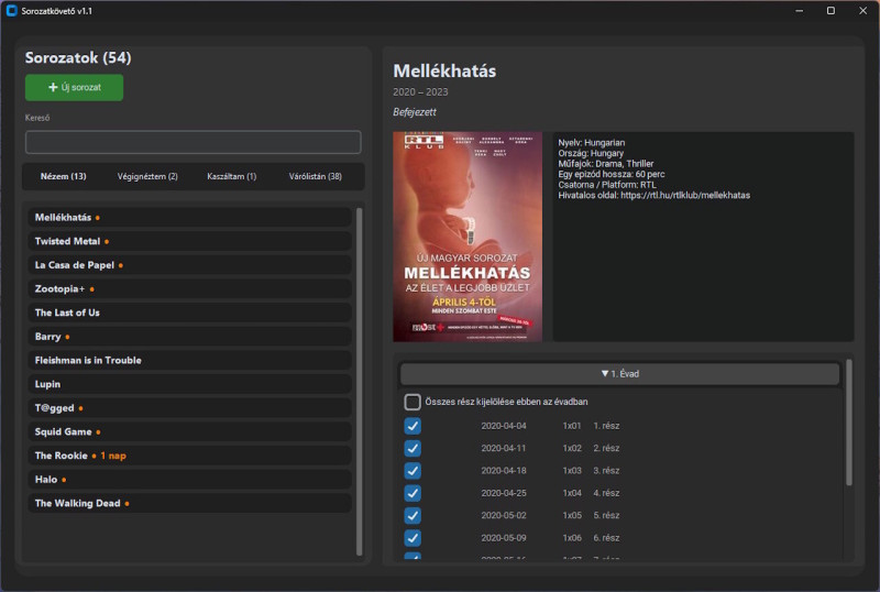Hozzáadni az Új sorozat megnyomásával lehet, elég beírni a sorozat eredeti címét vagy ha biztosra akarsz menni a tvmaze linkjét mert onnan kéri le az adatokat.