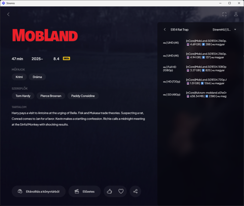 Miután telepítettük az StremHU | Source addont a Stremio-ba, csak megkeressük a tartalmat, amit nézni szeretnénk és kiválasztjuk a megfelelő torrentet a listából.