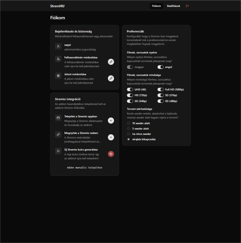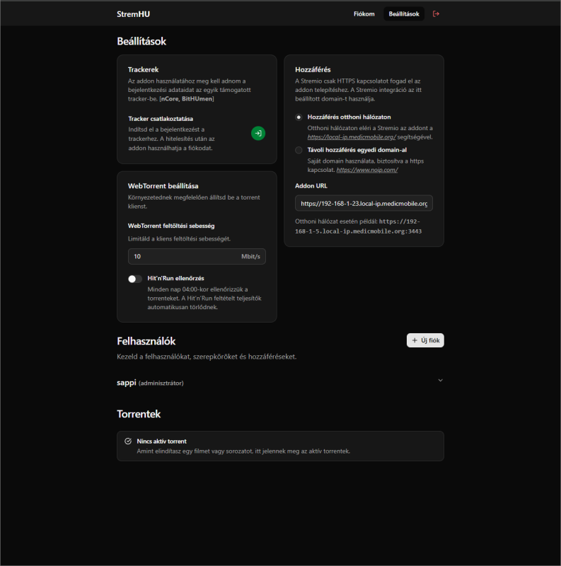 - Felhasználókezelés – mindenki saját preferenciákkal használhatja az addont Stremióban, anélkül hogy megosztanád a tracker-hozzáférést.