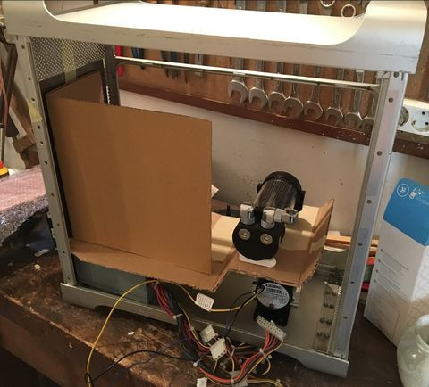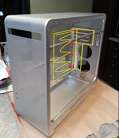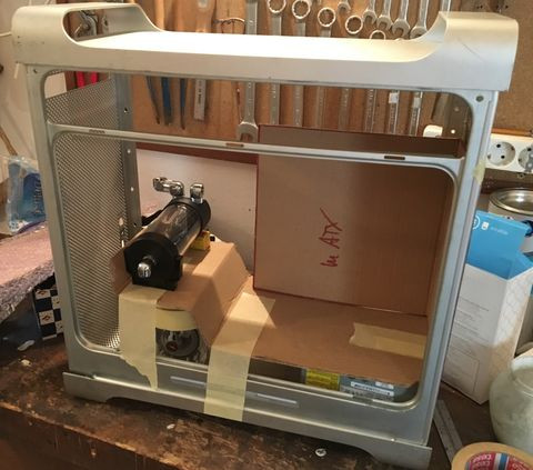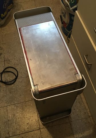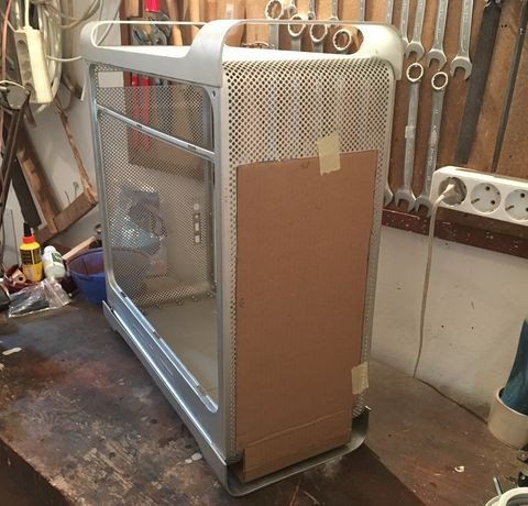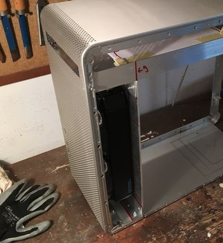 A hdd-ket, illetve a tartályt szintén a középső részben tervezem beépíteni. Az alaplapi tálca helyzetét is meg kell említeni. Mivel ez az alma ház eredendően nem kompatibilis a pc-s alaplapokkal, ezért dúrvább beavatkozásokat kell eszközölni. Arról van szó, hogy ki kell vágni a ház majdhogynem teljes hátsó felét azért, hogy az általam elképzelt helyre lehessen rakni az alaplapot. Az egész alaplapot, így a ház gyári pci(-e) kivezetéseit is egy kicsit a ház közepe felé szeretném elmozdítani kb 2-3 cm-rel, úgy hogy egy olyan alaplapi tálcát készítek a házhoz, amely a gyári "felfüggesztéssel" ellentétben nem a külső g5 héjjhoz tartozik, hanem a belső egységhez lenne csatlakoztatva valamilyen módon.