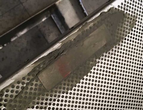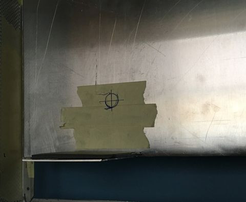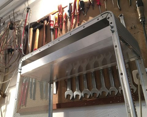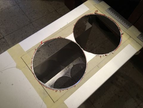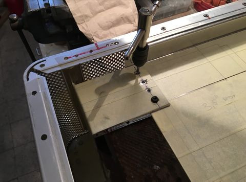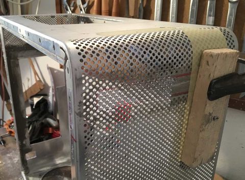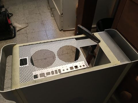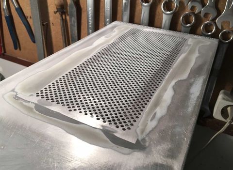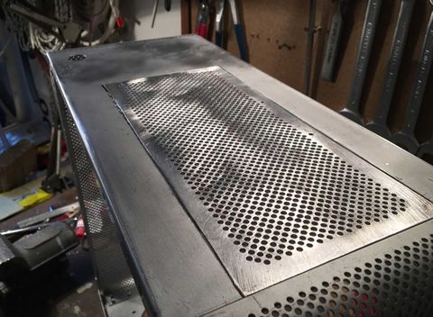 Ezzel párhuzamosan a gp tetejében lévő nyílásra is vágtam lemezt. Eredetileg az volt a cél, hogy ugyan ilyen mintájú perforált lemezt vágatok oda, hogy szo*assam le magam, de aztán mégis sikerült. Nem volt pont olyan lyukméretű, elrendezésű lemez, úgyhogy úgy döntöttem hogy magam fúrom ki a "mintát" a lemezből. Eltartott egy darabig..