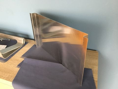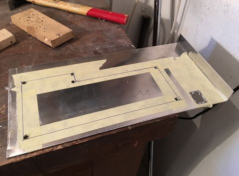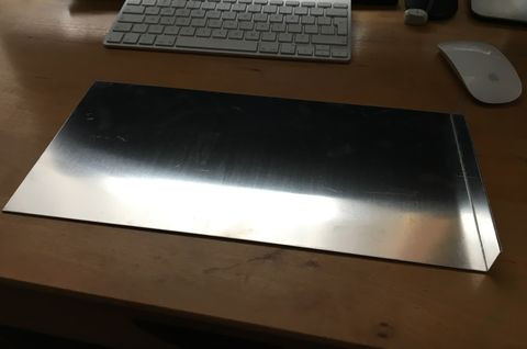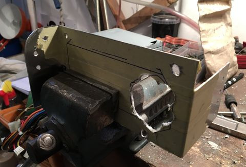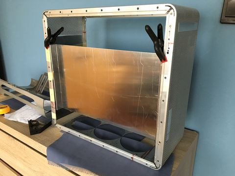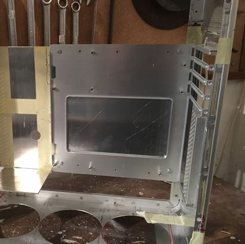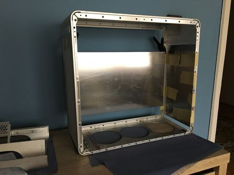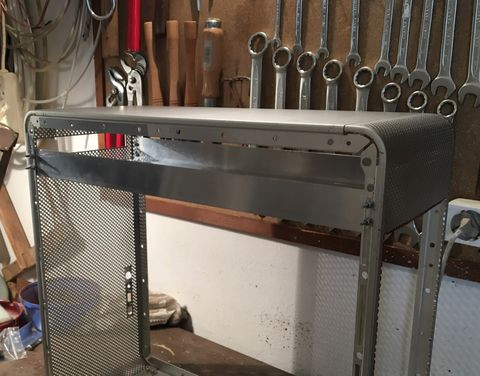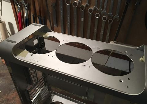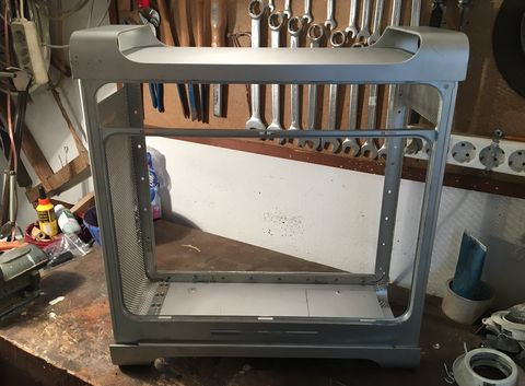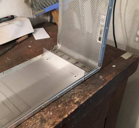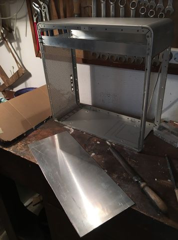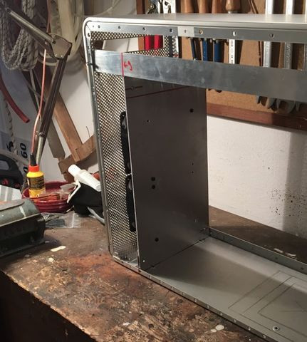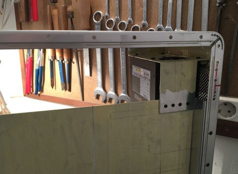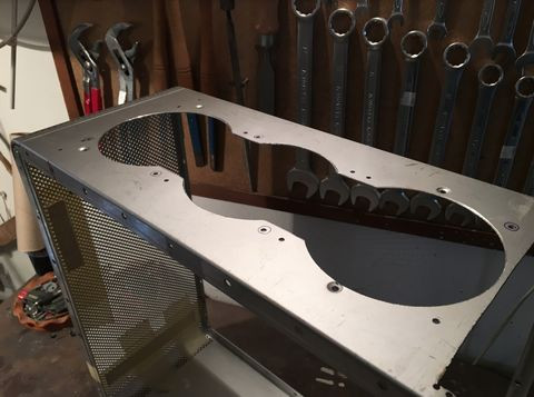 A tápsüllyesztős dolgot elvetettem, mert egyrészt nem esztétikus, hogy kilóg a gép "bele" a gépház alján, másrészt, annyit nem nyerek vele, mint amennyi idő átfarigcsálni a kuckót. Maradt a sima verzió a hátlapra. Készítettem másfeles acéllemezből egy próba hátlapot, saját magam hajlítottam meg, szerintem látszik is