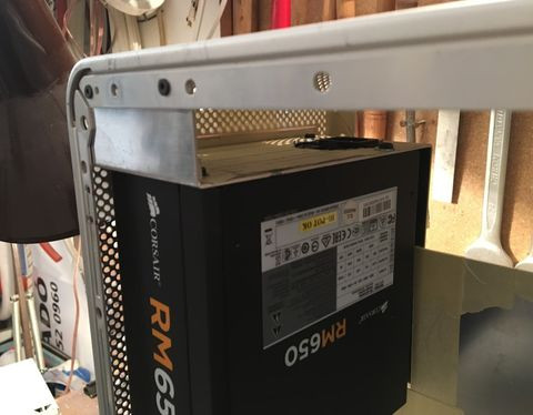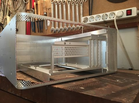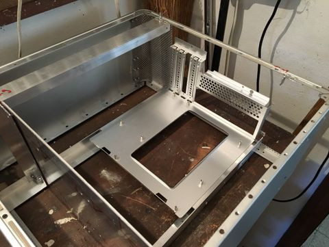 Az új alaplaptartó konzolra nyilván újra fel kellett installálnom a táptartót, illetve az alaplaptartó tray-t. Utóbbit az első verzióhoz képest máshogy csináltam. Szegecsanyás módszerrel rögzítettem, mivel a korábbi másfeles aluba fúrt menet eléggé lepkefingnak tűnt.