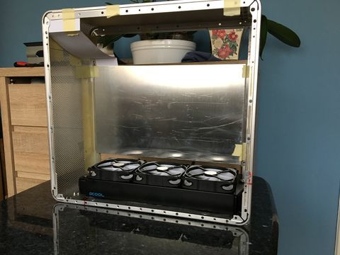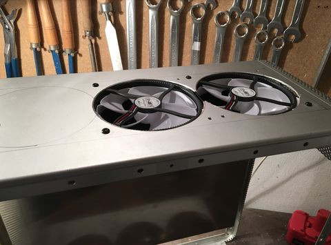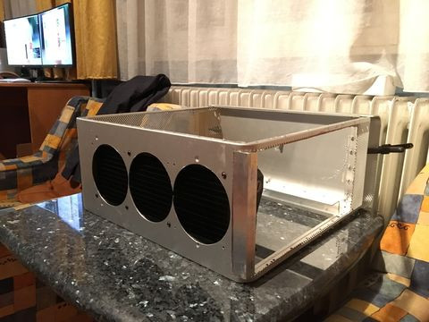 ) véglegesnek tűnő terv szerint a tripla radi bekerül a ház aljába. Ésszerűnek tűnik a döntés, hiszen a "leghidegebb" levegő a lenntről jön illetve nem tudtam volna elszeparálni a házban a radikat a hardverektől, tehát így a fő hőleadó egység az egész ház által felmelegített levegőt kapta volna meg, és ezt nagyon nem szerettem volna. Szóval a radi lenntre került. Ez a része meg is van a dolognak: