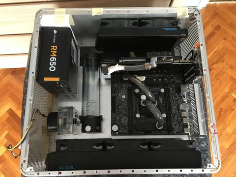 Ehhez az elrendezéshez azonban úgy döntöttem, hogy újracsináltatom az alaplaptartót. Egy kicsit vastagabb lett és "rá lett integrálva" a pumpa helye: