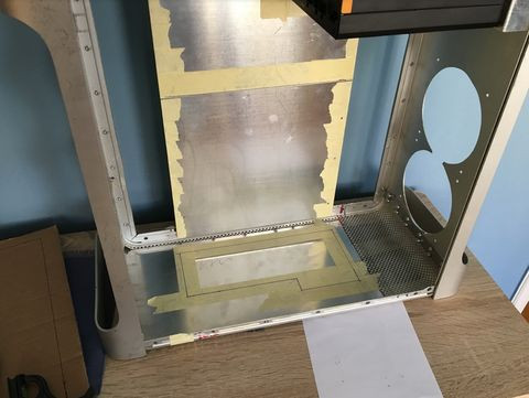 A ház elejénél az optikai lyuk-, illetve a gyár front I/O panel helyét el akartam tüntetni teljesen, az volt a terv, hogy azt teljesen homogenizálom. Kivágtam megfelelő méretű aludarabokat, majd beragasztottam.
