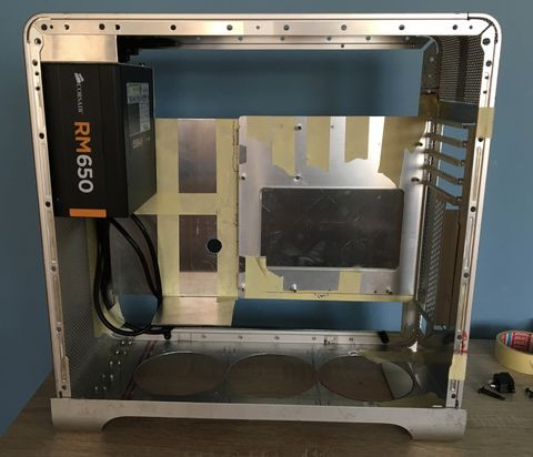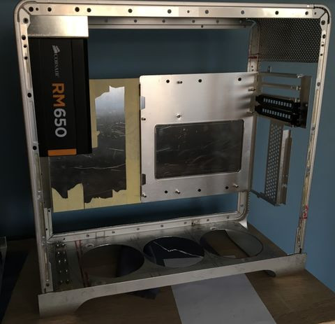 A fenti képen látható, hogy a táp megfelelő (helyspórolós) elhelyezése miatt a ház hátulján-alján egy kicsit jobban bele kellett nyúlni a házba. Sőt, itt azt tervezem, hogy leviszem a tápot a ház alja alá 1-2 centivel és a következő képpen fogom a takaró lemezt elhelyezni:
