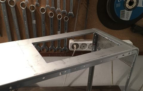 Kezelésbe vettem a ház fix oldallapját. Úgy döntöttem, hogy az eredetitől teljesen eltérő nyitási mechanizmust építek be a házba. Gázteleszkópok segítségével mindkét oldallapot felfelé nyithatóvá szeretném csinálni. Szereztem is 60 Newton-os teleszkópokat mezei bútoralkatrész boltból. Egy kicsit erősnek tűnik így első blikkre, de majd a végén kiderül. Ja igen, ehhez ugye elengedhetetlen, hogy elválasszuk egyéstól a tálcás oldal oldallapját: