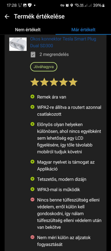 Minden, amire nekem szükségem van leolvasható, és az appból menedzselhető, le és felkapcsolható, időzíthető stb... Nagyon jó cucc!