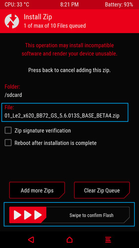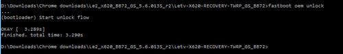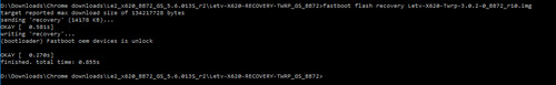 Mi sem egyszerűbb, mint a korábban említett TWRP mappából a flash_TWRP.bat fájl lefuttatása, de ha a parancssornál szeretnénk maradni, akkor ott is kiadhatjuk a parancsot:fastboot flash recovery Letv-X620-Twrp.img (értelemszerűen, ha másik recovery-t szeretnél telepíteni, akkor a megfelelő nevet kell behelyettesíteni a fájlnévhez)