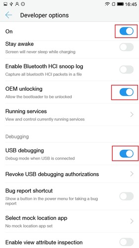 Következő lépés, hogy visszamész a beállításokba és ott a most megnyitott developer menüben bekapcsolod az USB debugging kapcsolót, valamint a többi képen jelzett kapcsolónak is aktiválva kell lennie, ha eddig nem így volt.