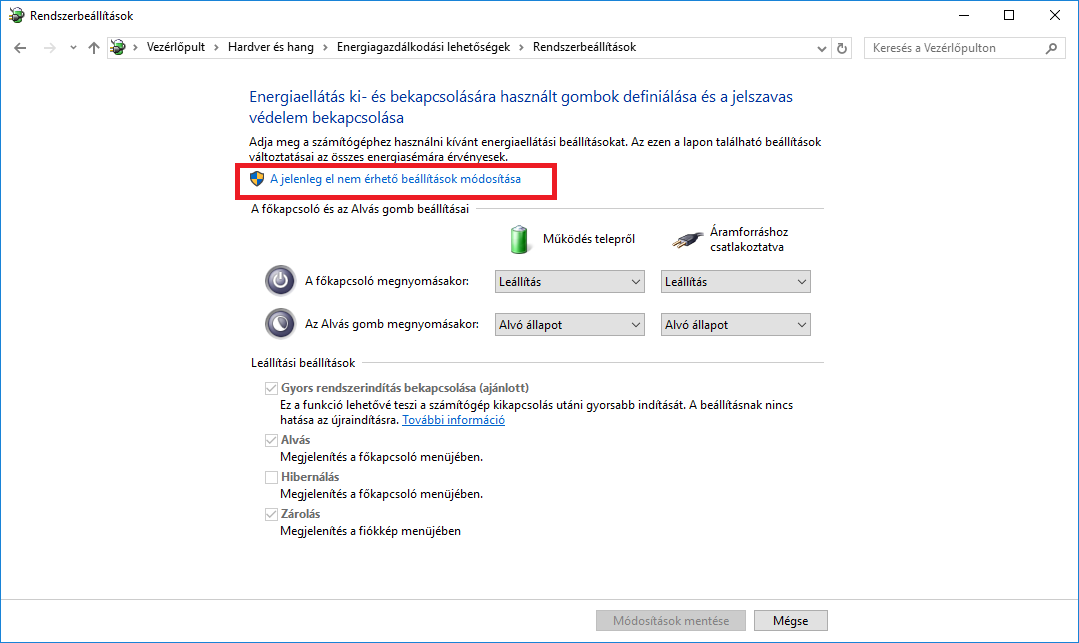 3, Mivel az általunk módosításra váró "Gyors rendszerindítás bekapcsolása (ajánlott)" menüpont szürke, ezért előtte rákattintunk "A jelenleg el nem érhető beállítások módosítása" lehetőségre. Rendszergazdai jogosultsággal kell rendelkeznünk mindehhez.![]()