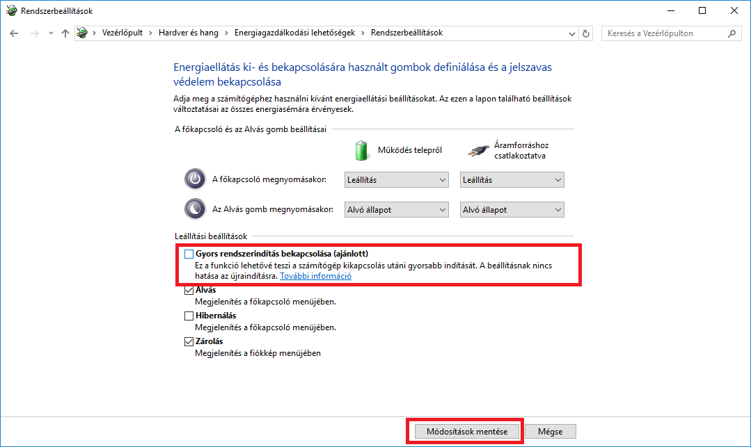 4, Eltüntetjük a bekapcsolást megkeserítő pipát a "Gyors rendszerindítás bekapcsolása (ajánlott)" lehetőség elől, majd rákattintunk a módosítások mentése gombra.![]()