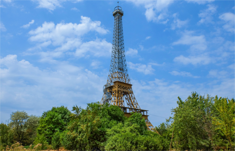 Kharkivben is van egy másolat az Eiffel toronyról, amely a városi látványosságok közé tartozik. Az installáció a „French Boulevard Mall” bevásárlóközpont mellett áll, ami önmagában is „francia boulevard” hangulatot kíván teremteni a városban. Az egyik cikk szerint a torony kb. 35 méter magas és tömege hozzávetőlegesen 35 tonna — tehát körülbelül tízszer kisebb az eredetinél. Ez a másolat nem csupán dekoráció: este fények világítják meg, és a bevásárlóközpont környékének emblematikus eleme lett, "mini Párizs” hangulatot hozva a kelet-ukrajnai városba. A háború miatt nehéz utána nézni, de reméljük, hogy még áll a torony.