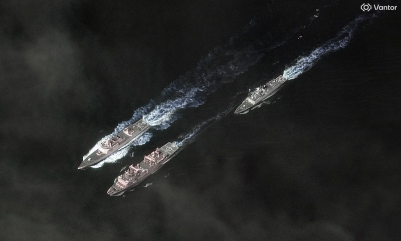 Műholdkép a Vantor cég által publikálva, két kínai hadihajóról és egy logisztikai ellátó hajóról