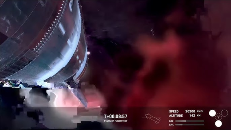 - Super Heavy – Ezúttal nem a toronyhoz visszatérés volt a terv, hanem vízre szállás és a határok feszegetése. Azonban a visszatérési fázis közben egyszer csak felrobbant a fokozat. A megosztott információk szerint a korábbinál nagyobb erőhatások megrepedt több belső hajtóanyag-vezeték, a folyékony oxigén és a metán egymásra talált, amit kirobbanó hatással ünnepeltek meg.