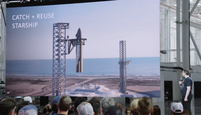 Musk a 2025-ös terveket prezentálve a StarShip elfogását mutatja májusban