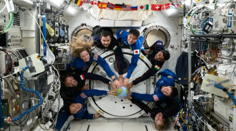 Az Expedition 73 csoportképe, a Crew-11 tagjai kék kezeslábasban (Platonov, Fincke Cardman és Jui)