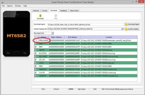 A telóból kivesszük az akkut, majd az USB-re dugjuk. A windóz felismeri a preloader módot és telepíti a Preloader drivert. Az SP Flashtool programban Download gombra kattintunk, a frissítés automatikusan elindul. A folyamatot alul jelzi, majd a végén egy nagy ződ körnek kell megjelennie.