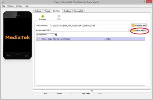 Kitömörítjük az SP Flashtool-t majd az új, telepítendő ROM-ot tartalmazó G3C-20140507-093620.7z archívumot is. Elindítjuk a flash_tool.exe-vel. Előzékenyen szól, hogy nincs scatter file, leokézzuk, köszi. A Scatter-loading gombra kattintva betallózuk az új, telepítendő rom könyvtárából a MT6582_Android_scatter.txt fájlt.