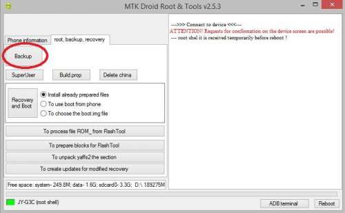 A ROOT gombra kattintva megkérdi, hogy a meglévő SU segítségével kapjon-e root shell-t, ezt leokézzuk majd nemsokára meg is kapjuk a root jogot. A készülék képernyőjén esetlegesen megjelenhet a kérdés, hogy root-jogot adunk-e neki. Ez után a felső menüben kiválasztjuk a "root, backup, recovery" részt és a nagy Backup gombra kattintunk: