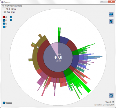 Leginkább olyankor kerül elő, amikor betelik a winchester, ez a progi ugyanis azt mutatja meg nagyon látványosan és intuitívan, hogy mi mennyi helyet foglal el a merevlemezünkön. Ehhez az indításakor átnézi az egész diszket - kicsit várni kell -, majd egy körgyűrű-diagrammon elénk tárja a teljes mappastruktúrát. Méghozzá úgy, hogy minden mappa és file a méretével arányos nagyságú (szögméretű) körcikkely képében jelenik meg a diagrammon. Egyből a szemünkbe ötlik tehát, ha a fél meghajtón csupán egyetlen mappa terpeszkedik (ennek a neve tipikusan xxx, filmek, vagy valami hasonló szokott lenni