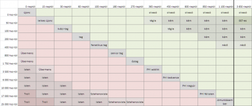 Egyébként elgondolkodtam azon, hogy itt vagyok, mint lassan 15 éve tag, és csak azért, mert nincs szófosásom, nem vagyok a legmagasabb rangba sorolva. Én csinálnék egy PH veterán rangot a legalább 10 éves tagoknak, és kérésre beállítanám nekik (mármint hogy írnék ezeknek a usereknek és ha igénylik, beállítanám, különben maradhatna a normál rangjuk).