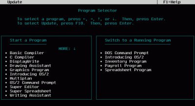 A Microsoft 1985 augusztusában aláírta az Egyesített Fejlesztési Szerződést az IBM-el. Az OS/2 1.0-s verzióját 1987-ben adták ki, kizárólag szöveges módban futó operációs rendszerként, azonban rendelkezett gazdag alkalmazásprogramozási felülettel a videovezérlő részére, egér- és billentyűzetek kezelésére, valamint védett módú BIOS-szal is. A video- és billentyűzet API-k elérhetőek voltak a programok közötti váltáshoz MS-DOS-ban is. Egy feladatváltó is volt a rendszerben Program Selector néven, a Ctrl-Esc billentyűkombinációval válthatott a felhasználó a többfeladatú szövegmódú folyamatok között.