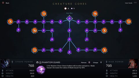 Ezekből a Core-okból kétféle van, a kicsi általánosabb szörnyekért és a Boss-okért másmilyen jár. A kék színű értelemszerűen a kicsiké, a nagy sárga pedig a főellenségekéi. Alapból 3 típusúak lehetnek, a szívecskés az életerőre, a spirálos a haragra (Wrath) míg a kardos a támadásra ad valamilyen bónuszt de csak akkor ha megfelelő helyre teszik őket az ágakon. Ezen felül minden Core 2 szintet tud fejlődni és így maximálisan 3-as szintűvé válni, amivel az általuk adott bónuszok is javulnak, de ezeket is csak akkor kaphatjuk meg ha jó helyre kerülnek amit a szimbólum alján jelzett 1, 2 vagy 3 pötty jelöl.