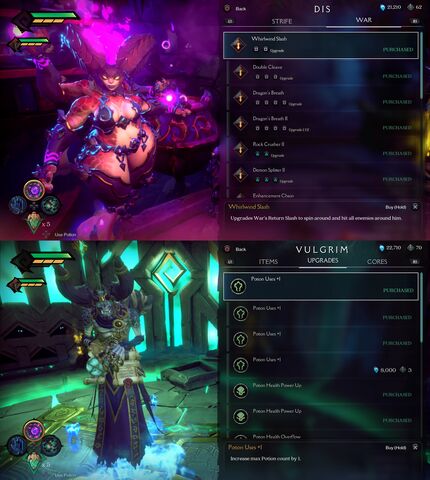 Karaktereink remekül kiegészítik egymást annak ellenére, hogy merőben más a személyiségük és a képességeik. War inkább a közelharcban jeleskedik, míg Strife két hatalmas pisztolyával a távolsági harcot részesíti előnyben. Természetesen mindkettőjüknek van lehetőségük a másik támadástípust alkalmazni, de azok a támadásaik jóval gyengébbek. Hőseink nem fejlődnek szimplán harccal szerzett tapasztalat útján, nem kapnak újabb képességeket vagy támadásokat. Ezeket fel kell kutatni a térképeken vagy lelkekért cserébe vásárolhatjuk meg egy részüket a korábban említett két szereplőnél.