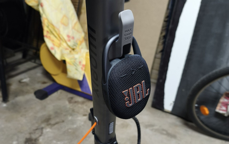 A kormány alatt továbbá kapunk egy 3kg-ig terhelhető kis kampót is ami tökéletes a JBL Clip 5-nek.