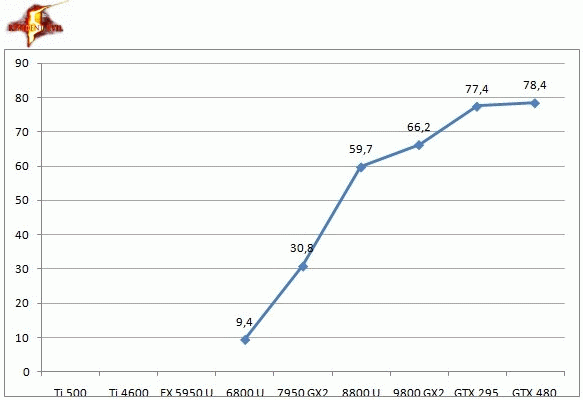 Végre egy teszt, ahol a GTX 480 kifuthatta magát. A két duplamagos monstrum is megmutatta mit tud, a 8800 Ultra itt nem igazán rúgott labdába, bár helytállása így is becsületes.