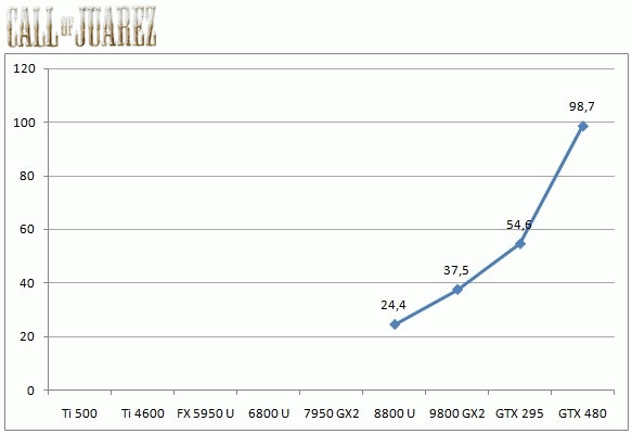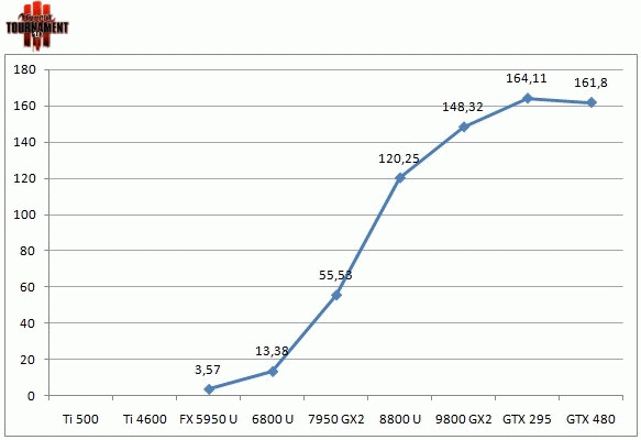 AZ UT3 egy másik nagy népszerűségnek örvendő FPS játék. Csak DirectX 9-es kártyákon indult el, bár az FX-el inkább állóképeket renderelt, mint mozgalmas jelenetet. A 7950 GX2 most szépen helytáll, a 8800 Ultra jó szereplésén pedig már meg sem lepődünk. A GTX 295 és a GTX 480 processzorlimitbe ütközött.