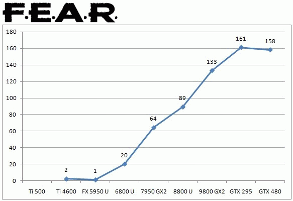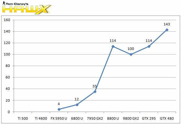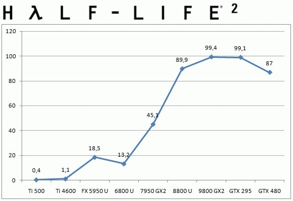 A Half-Life 2 talán a legnépszerűbb FPS játékok egyike. A GF3 és GF4 kártyákon igencsak kifogott ez a teszt, ami valószínűleg annak köszönhető, hogy nem rendelkeznek elég memóriával ehhez a játékhoz Full HD felbontásban. Meglepő lehet, hogy az FX gyorsabb volt a 6800 Ultránál, de gyorsan tegyük hozzá, hogy a Source motor nemes egyszerűséggel DX8-as kártyának ismeri fel az FX-eket, és nem is állíthatunk be DX9-es shadereket. Ebben az FX-ek köztudomásúan gyenge DX9-es teljesítménye mellett valószínűleg az is szerepet játszik, hogy a fejlesztést az ATI pénzelte. A 7950 GX2 szépen elgyorsul a 6800 Ultrától, a 8800 Ultra szintén jól szerepel, fölötte pedig már processzorlimitről beszélhetünk. A GTX 480 szerint a HL2 megintcsak nem egy "Performance 3D" alkalmazás