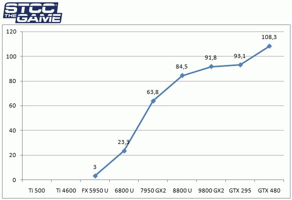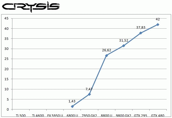 A Far Cry utódjának tekinthető Crysis híresen rosszul optimalizált játék: még a GTX 480-al is csak 42 FPS-t produkált. A 6800 Ultra és a 7950 GX2 állókép-renderelő bajnokságát viszonylag szép fölénnyel nyeri a szendvicskártya, a 8800 Ultra fölénye viszont ismét döbbenetes. Fölötte a grafikon lineáris emelkedést mutat. Kíváncsi lennék, hogy egy GTX 590-el milyen eredmény születne... Talán meglenne a mesebeli 60 FPS is?