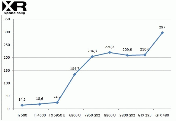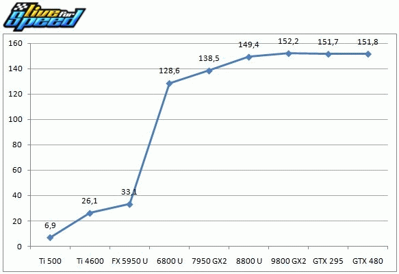 Ez egy picit régi, ám egész szép grafikájú arcade Rally játék, mely azomban inkább védelmi rendszeréről híresült el. A tesztelt felbontás 1024x768 volt. Az AGP-s kártyák itt is gyengélkedtek, akárcsak az LFS-ben, hiszen a grafika nem annyira komplex, ami a 6800 Ultra ilyen mértékű előnyét indokolná az FX-el szemben. 200-220 FPS körül pedig már processzorlimitről beszélhetünk, amiből viszont a GTX 480 érdekes módon ki tudott törni. Nem igazán tudom, hogy ez mitől lehet, csak egy tippem lenne: talán a GTX 480 saját hangcodec-e kevésbé terheli le a processzort, mint az alaplapi integrált hangkártya.