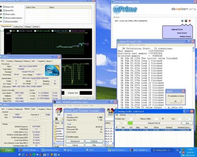 Jobb a felső sarokban a wPrime eredménye látható, ami az összes CPU magot kihasználva számolja a PI értékét, egészen a 32milliomodik tizedes jegyig. Alatta van a Super PI, ahol Pi értékét 1 millióig számoltattam, de ez a program a CPU egy magját tudja csak kihasználni. Illetve ez alatt található a Linx is, ami a CPU nyers számítási kapacitását írja ki, megy gigaflops-ban értetendő, illetve mellette van még egy Winrar benchmark is.
