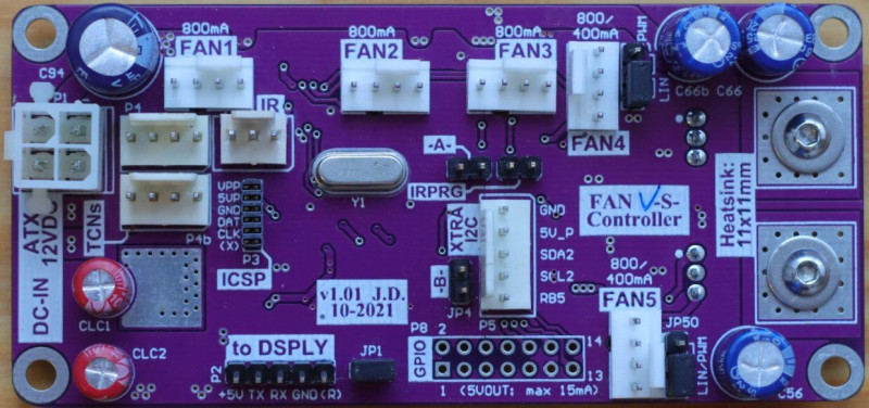 Regulátort csak a PIC/OLED és a TCN75-ök kaptak, vagyis megköveteli a nagyjából pontos, 12V-os, DC megtáplálást, mert a ventik erről direktben járnak. PC-ATX vagy egyéb kapcsolóüzemű táp teljesen jó, ami tudja az ATX2.0 szabvány szerinti kimeneti feszt. 13V DC fölé semmiképp ne emeljük, a ventik ki tudja meddig bírják a folyamatos túlfeszt, illetve a MOV is "megszólalhat".