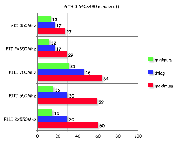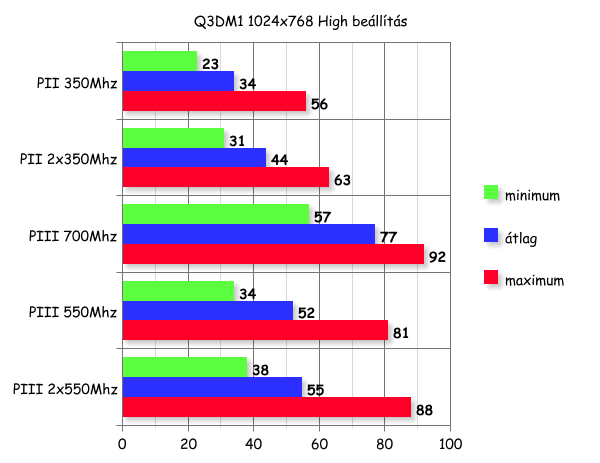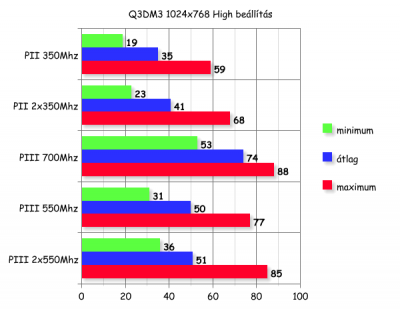 Jól kivehető az a pár FPS+ amit kicsikart magából a program a dual üzemmódnak köszönhetően. Nem számítottam 100%-os FPS növekedésre, de egy picit csalódott vagyok, nagyjából 40-50%-ot vártam, hisz a videokártya nem szól bele a dologba, ásítozva tesz a dolgát. Lehetséges hogy hiába 2x350 Mhz akkor is csak 350Mhz, talán ha kisebb kártyával, például egy GeForce 256-al próbálkozok, nagyobb kontraszt lesz az eredmények közt.