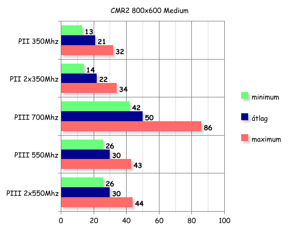 Harmadik és egyben utolsó játéktesztem a Colin McRae Rally második része volt, melyben ugyan azt a finn pályát választottam az 5 mérésnél. A grafikát 800x600-as felbontásban medium beállításra tettem, szegény 350-es P2 még ebben az esetben is kaparta a torkát rendesen.
