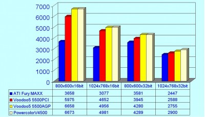 Itt még jobban kicsúcsosodik, ami már a 3Dmark2000-ben is látszódott. Az ATI 800x600-ban, mindkét színmélység mellett több pontot tud szerezni, ha nem is sokkal, Míg a Voodoo5 1024x768 mellett előzi be vetélytársát.
